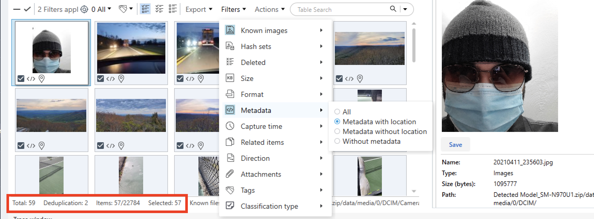 X-Ways Forensics was once again our best friend. It was sufficient, in this case, to use the "Refine Volume Snapshot" function to analyze all of the metadata present in the images and then filtering for the Metadata field. The "Canon EOS 5D Mark II" is the only camera model available.